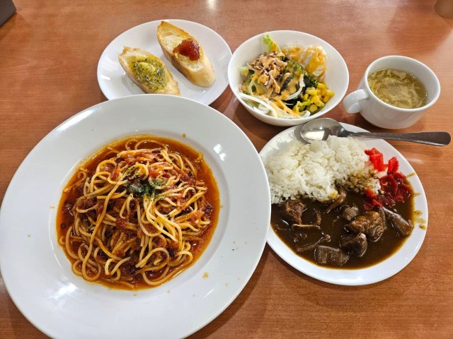さてさて、生パスタが到着したところで豪華なフルセットが完成。しかも、サラダ・カレー・スープ・パンは食べ放題だ。