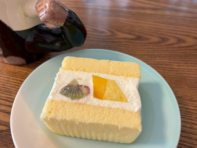 パイナップル、キウイ、苺が入ったフルーツサンドのケーキ版という感じ。スポンジはショートケーキと同じタイプなのか、しっとりとよりも軽め? で崩れやすい印象。