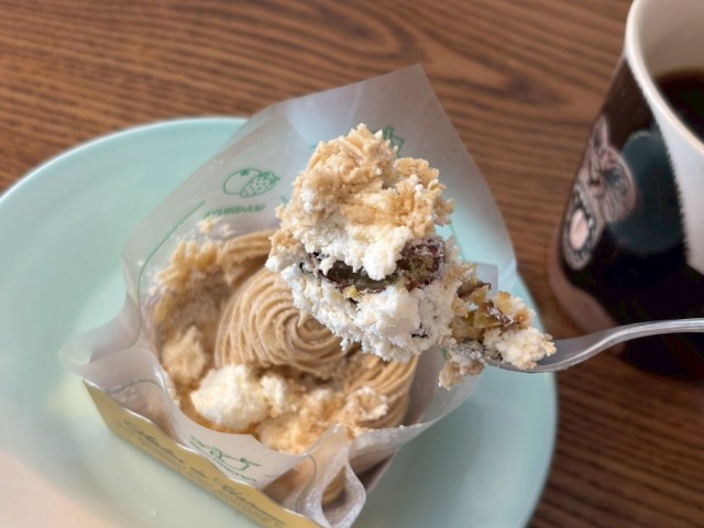 口コミでは「クリームがしっかりめ」という声があったが、本当に硬めで存在感がある。中には大きな栗の甘露煮が入っており、これは素直に美味しい。