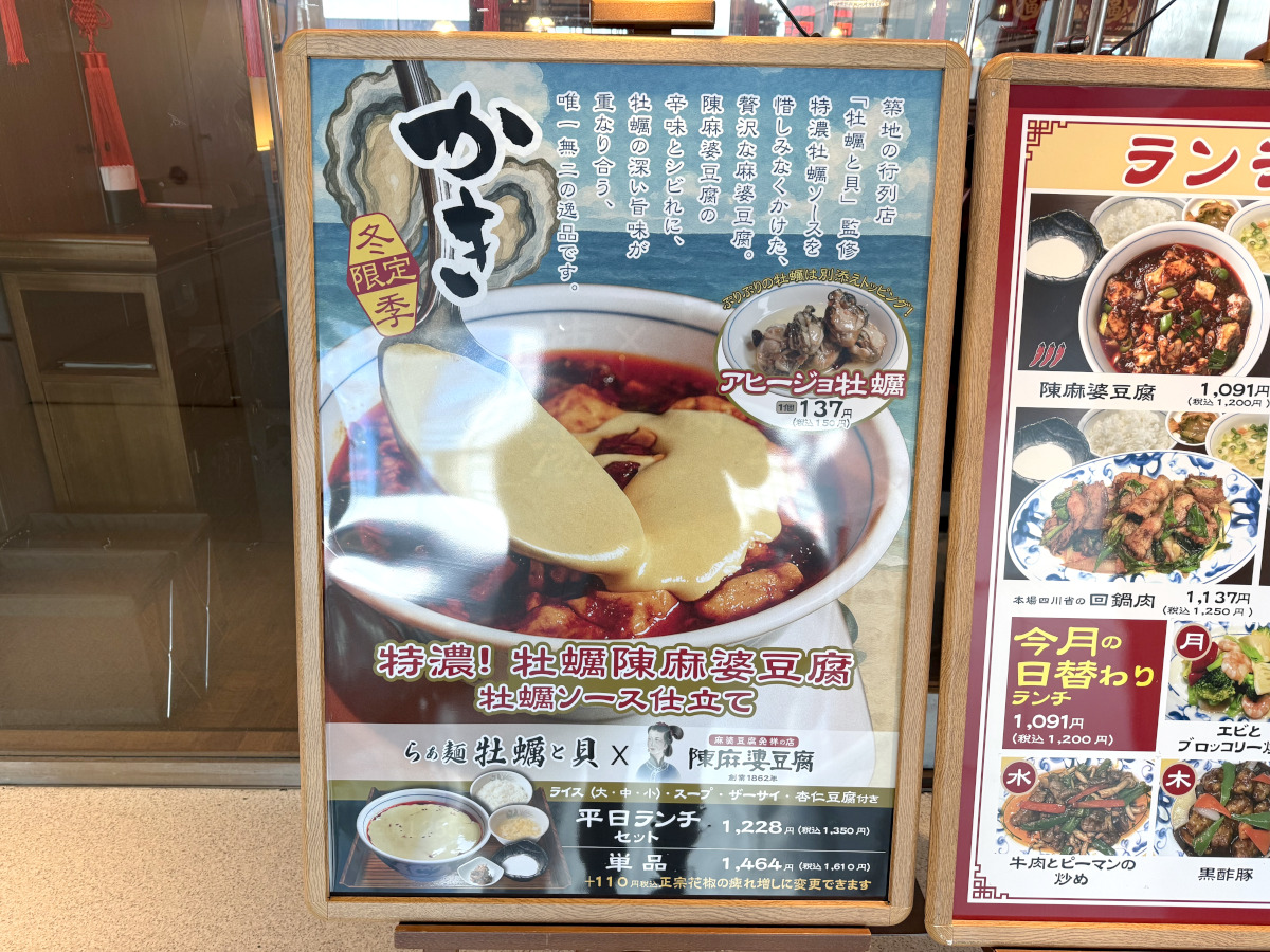 その陳麻婆豆腐の期間限定メニューが『牡蠣陳麻婆豆腐 牡蠣ソース仕立て』で、世にも珍しい牡蠣を使用した麻婆豆腐とのこと。ふむ、というか牡蠣と麻婆豆腐って相性いいんですかね?