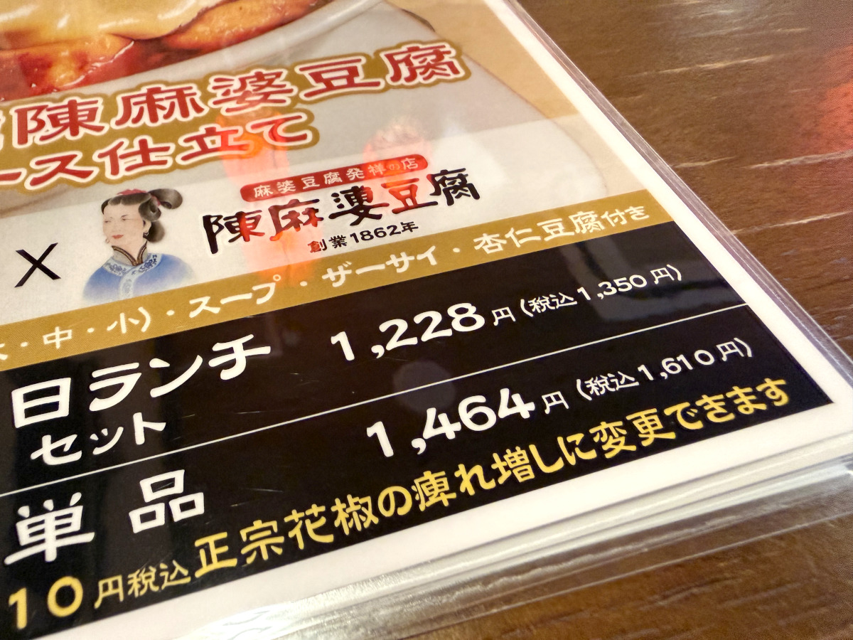 というわけで、最寄りの陳麻婆豆腐で『牡蠣陳麻婆豆腐 牡蠣ソース仕立て』をオーダー。価格は平日のランチセットが1350円で、単品だと1610円。なので可能ならば平日のランチタイムが俄然お得だ。