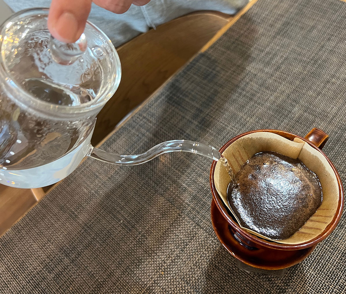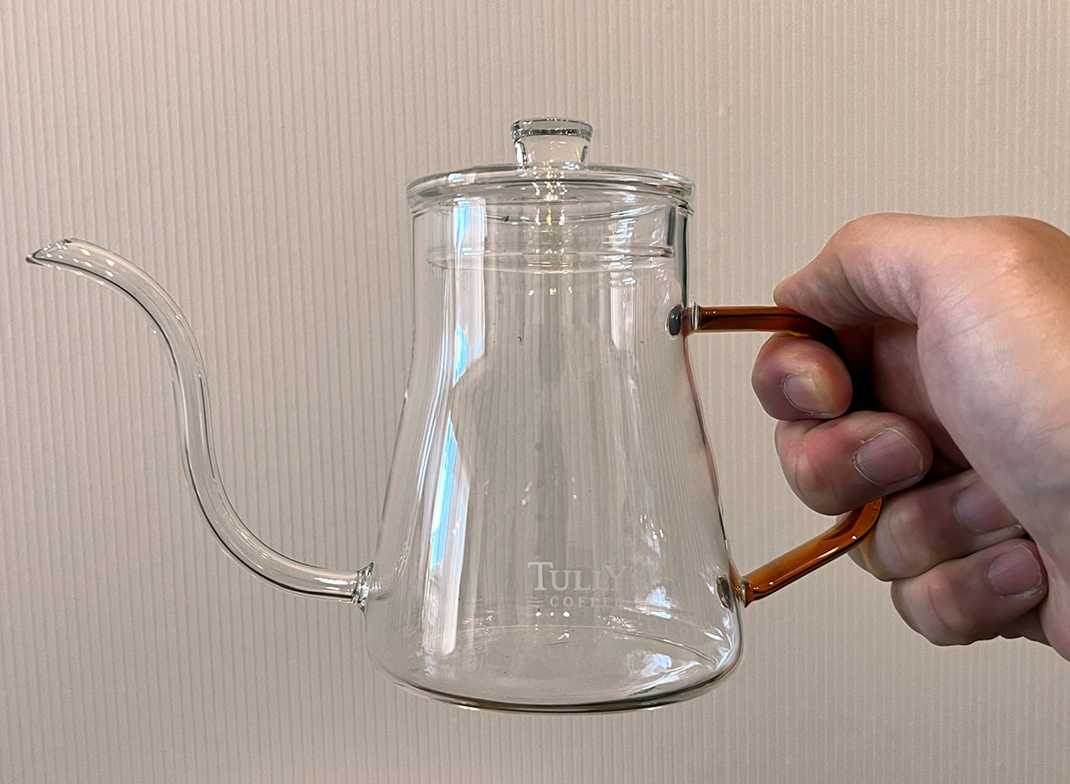 ▼耐熱ガラスポットも実際に使ってみた。先が細いので、確かにお湯は注ぎやすい。コーヒータイムの格が上がる印象だ