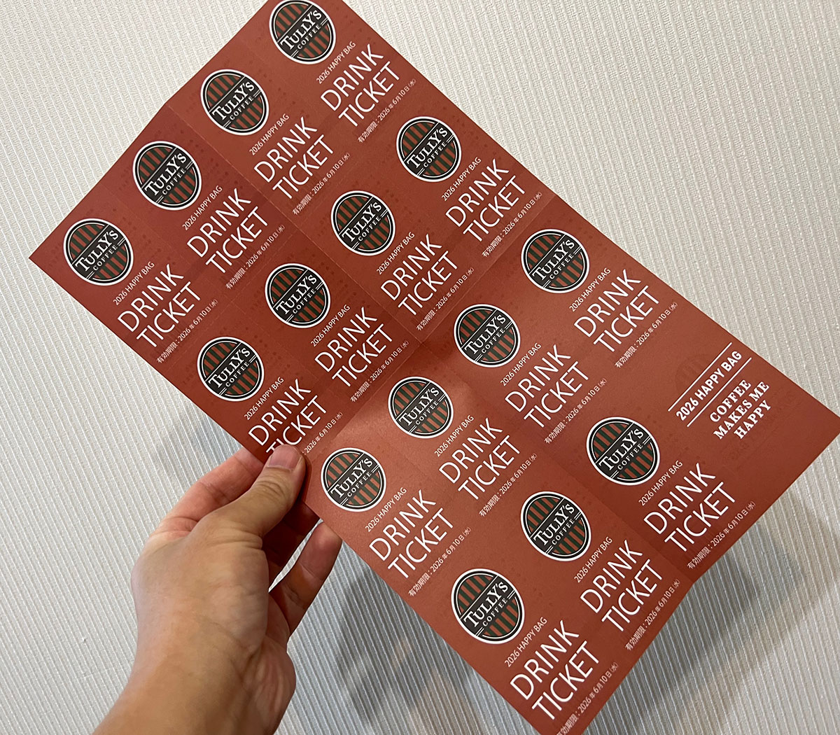 結論から言うと、大幅減の波は来ず! 2026年版のタリーズ1万円福袋に入っているドリンクチケットは15枚で、昨年2025年と変わらなかった。