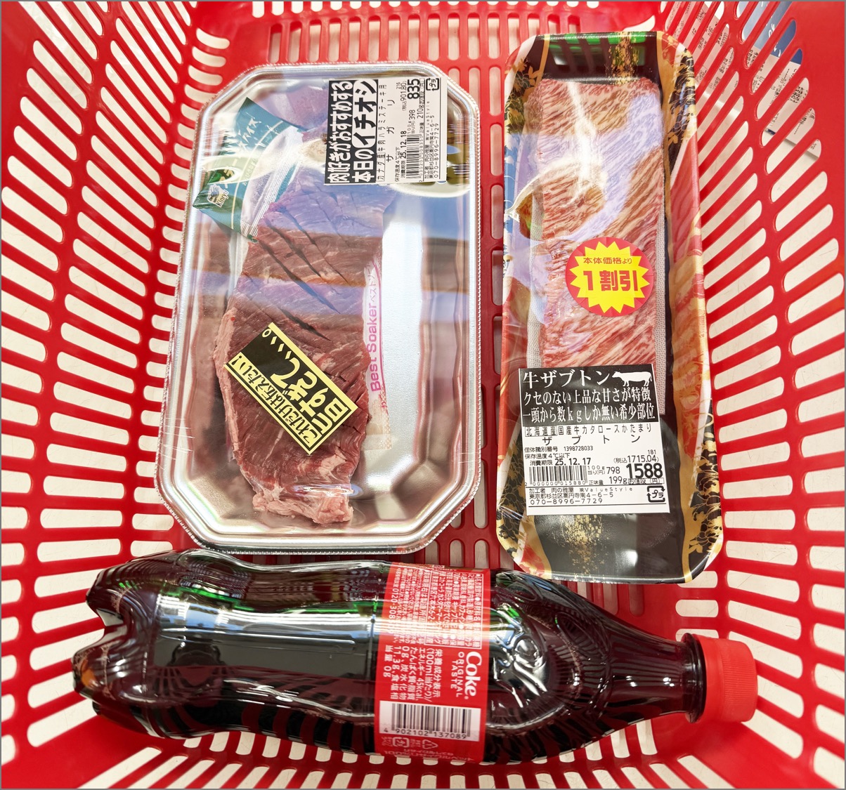 そんな親友の助言にならい、今回私は、ザブトン199g(1430円)とサガリ210g(835円)をチョイス。あとはコーラ(700ml)を業スーにて購入。