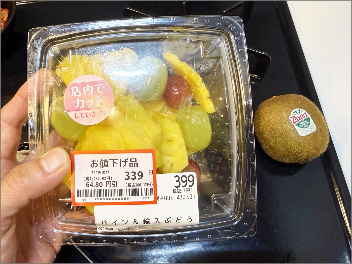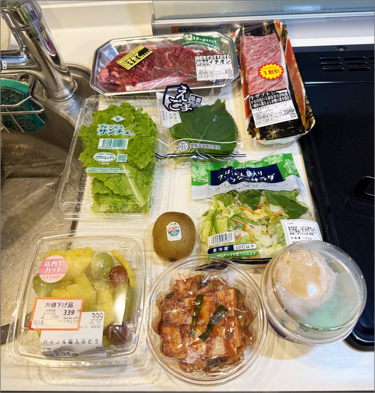 スーパーで、エゴマやサンチェやサラダなども揃えつつ、デザートとしてカットフルーツとキウイを購入。
