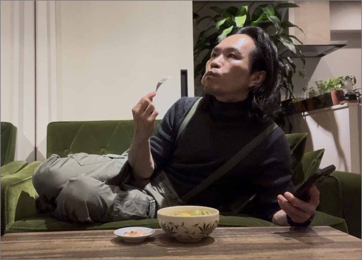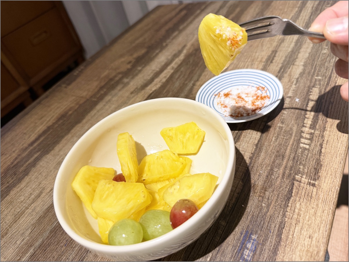 そして、ローテーブルにフルーツをドン。タイとかベトナムとかでよくある「パイナップルにつけるトウガラシ塩みたいなやつ」も自作。こんなの簡単だ。
