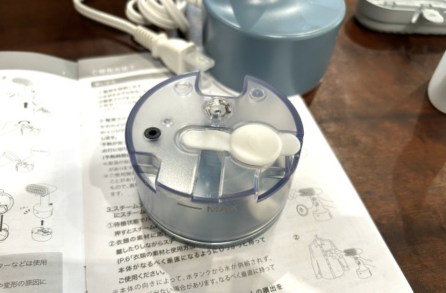 箱から取り出すと、まずそのコンパクトさに驚く。スペースを取らずに、どこにでもちょっと置いておけそうだ。落下にさえ注意すれば、ひっかけることができる形状をしている。底のタンクに給水をし、電源を入れてモードを選択すれば約25秒で立ち上がるという素早さも良い。