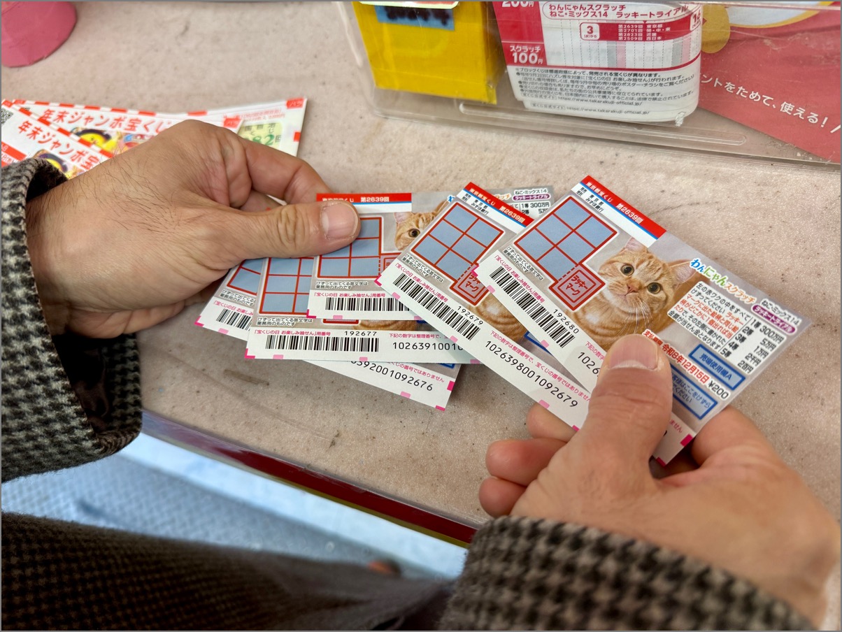 1万円を出し、1000円のお釣り。返す刀で、その1000円でスクラッチくじ(200円)を5枚購入。こちら、当たれば1等300万円なのだが……