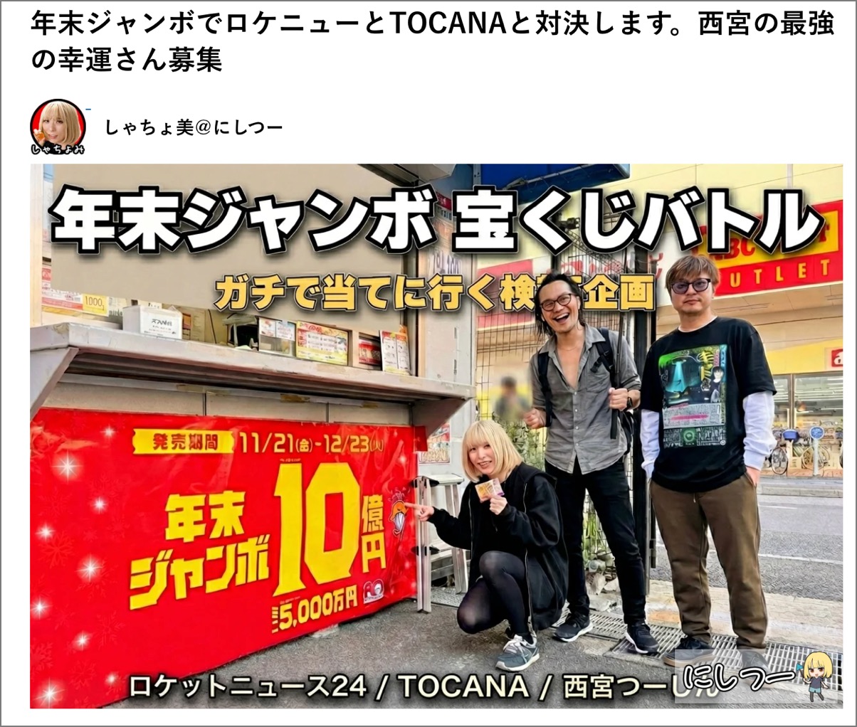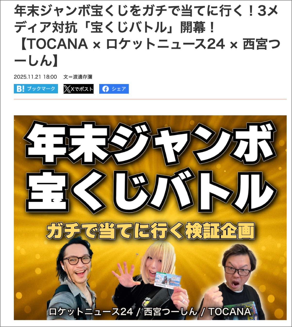 というのも、TOCANA × ロケットニュース24 × 西宮つーしん、3メディアによるガチ対決企画『年末ジャンボ宝くじバトル』に参戦しているからである。