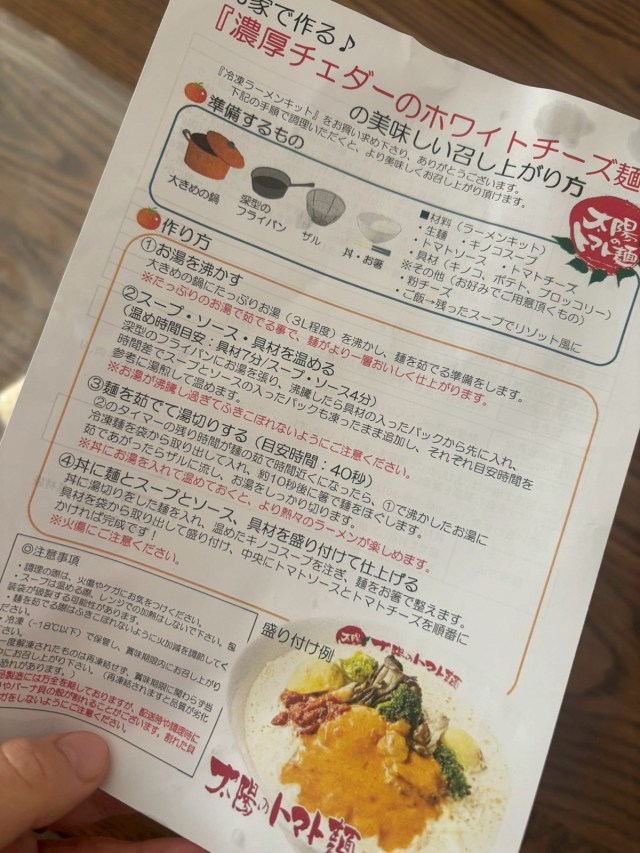 公式サイトによると、この商品は濃厚なチェダーチーズときのこポタージュを組み合わせたホワイトソースベースのトマトラーメンとのこと。麺も豆乳粉末を練りこんだこだわりの逸品。