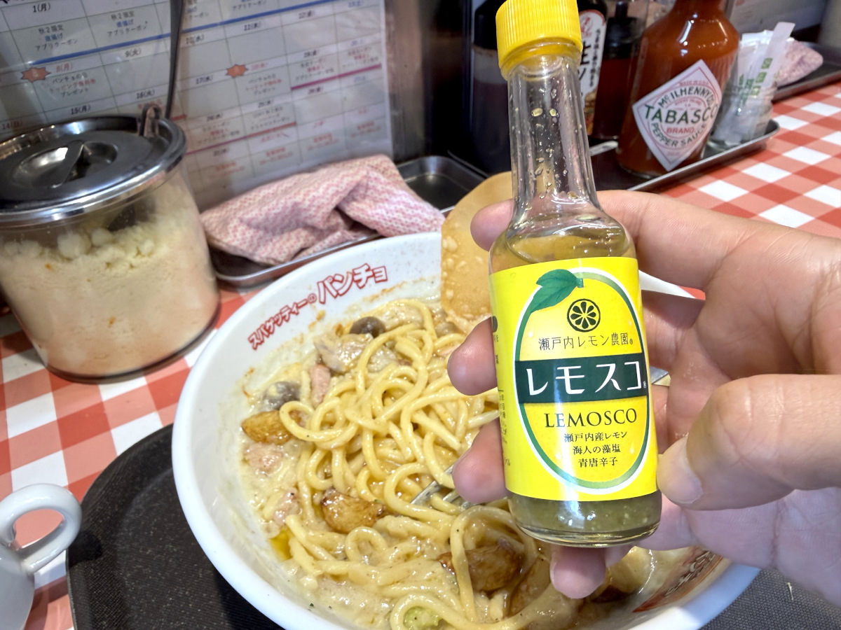 さらに言うと『シュクメルリ風パスタ』はとにかくパンチが効いており、1ミリも「締まりのある味」の要素は無かった。ズバリ、重い。卓上の「レモスコ」などで味を変えないと完食は困難であろう。