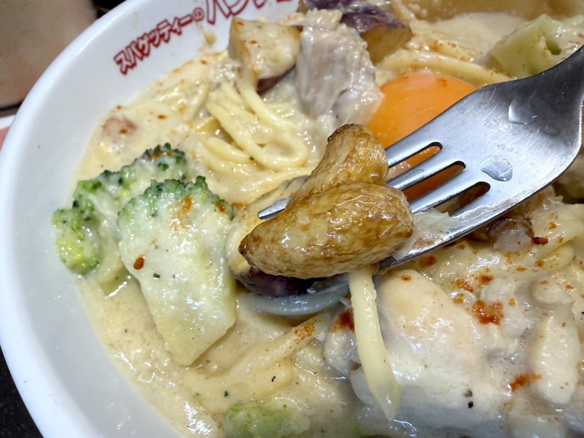 さて、今回発売された『にんにくとチーズの濃厚ソース シュクメルリ風パスタ』は、その白ナポを「セルフ魔改造した」とのこと。どうやら冬の定番「シチューナポ風」にアレンジを試みたようだ。