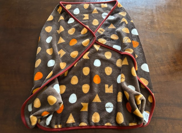 またなか卯の福袋史上初となる、ブランケットも悪くない。縦約70cm×横100cmと、膝の上にかけておくにはちょうど良いサイズである。肩から羽織った際に前で留められるボタンも付いているので、ふた通りの使い方ができそう。柄はトートバッグの内生地と一緒だ。