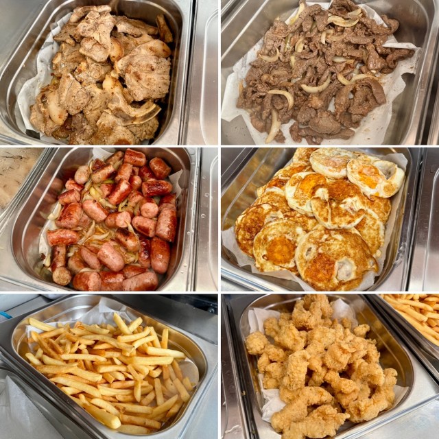 並んでいた料理は「牛肉玉ねぎ炒め」「豚ロースのグリル」「ソーセージの山」「目玉焼き」「ポテト山盛り」など。