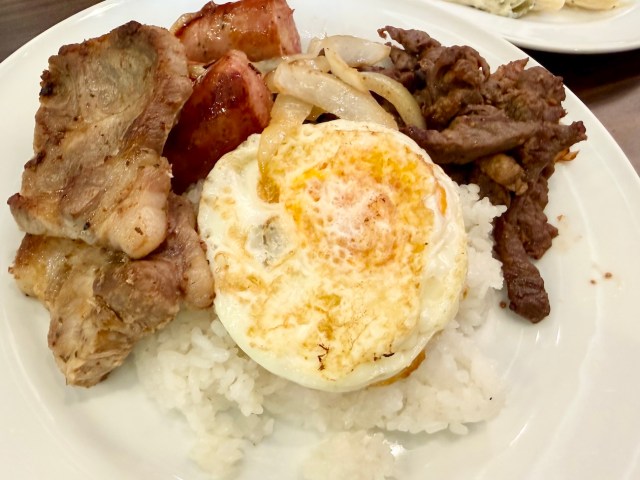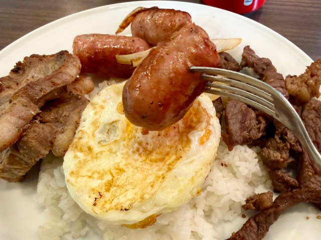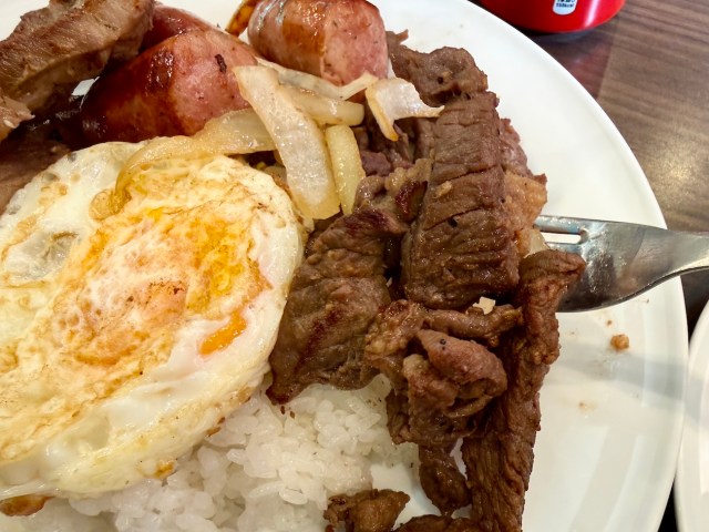 さっそく食べてみると、牛肉玉ねぎ炒めはバーベキューのような香ばしさで噛むほどに旨みが出る。豚ロースはしっとり & ジューシー。ソーセージは日本のものより巨大で塩気が強く、クセになる味。肉々しくて最高だ!