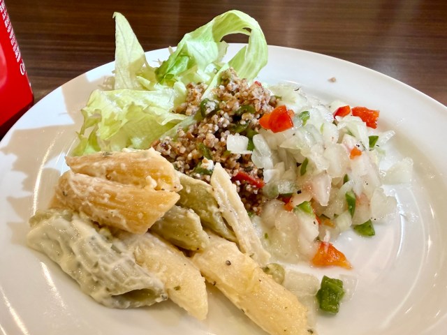 豆スープの「フェイジョン」や、酸味のきいた玉ねぎサラダ、マカロニサラダなどのサラダ類もズラリと揃っていた。