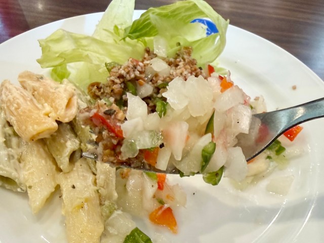 そんでもって目玉焼きは全体のまとめ役。サラダ系も優秀で、玉ねぎサラダの酸味が肉のオイリーさを中和してくれる。どうやら肉も野菜も白飯と一緒にかき込むのが正解らしい。食べ応えはMAX。これぞ情熱あふれるサンバ系ビュッフェである。
