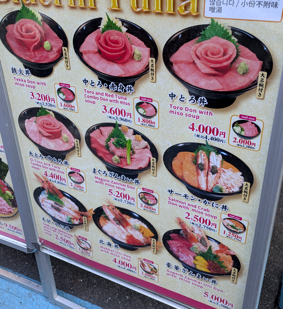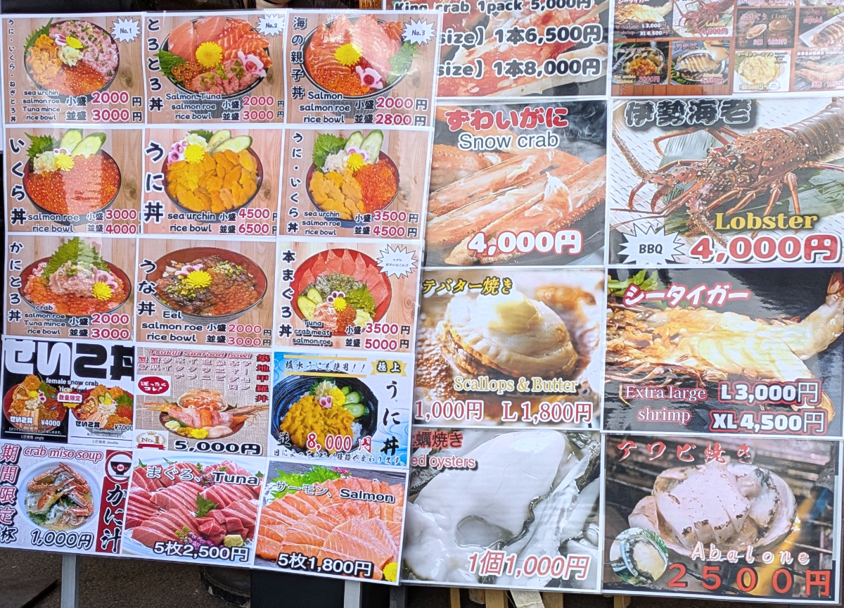 パッと目に入った海鮮屋のメニューを見ると……、値段は下がってねえか。むしろ、私が今年初めに訪ねたときよりも若干高くなってる気がする。海鮮系の丼ぶりは小盛でも2000円~だ、気軽に食えねえ……。