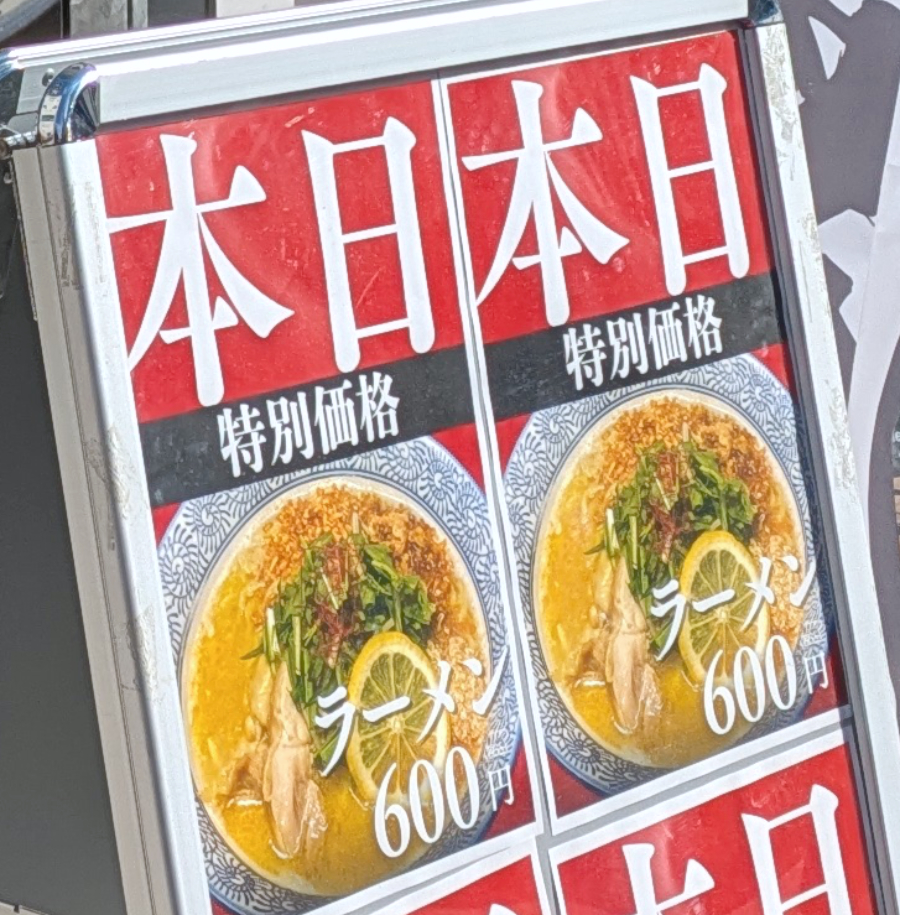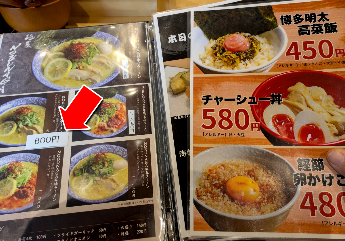 さて、入店してメニューを見ると、表に出ていた「NOBUNAGAラーメン」は本当に600円だった。ちなみに普段は税込980円で提供しているようである。