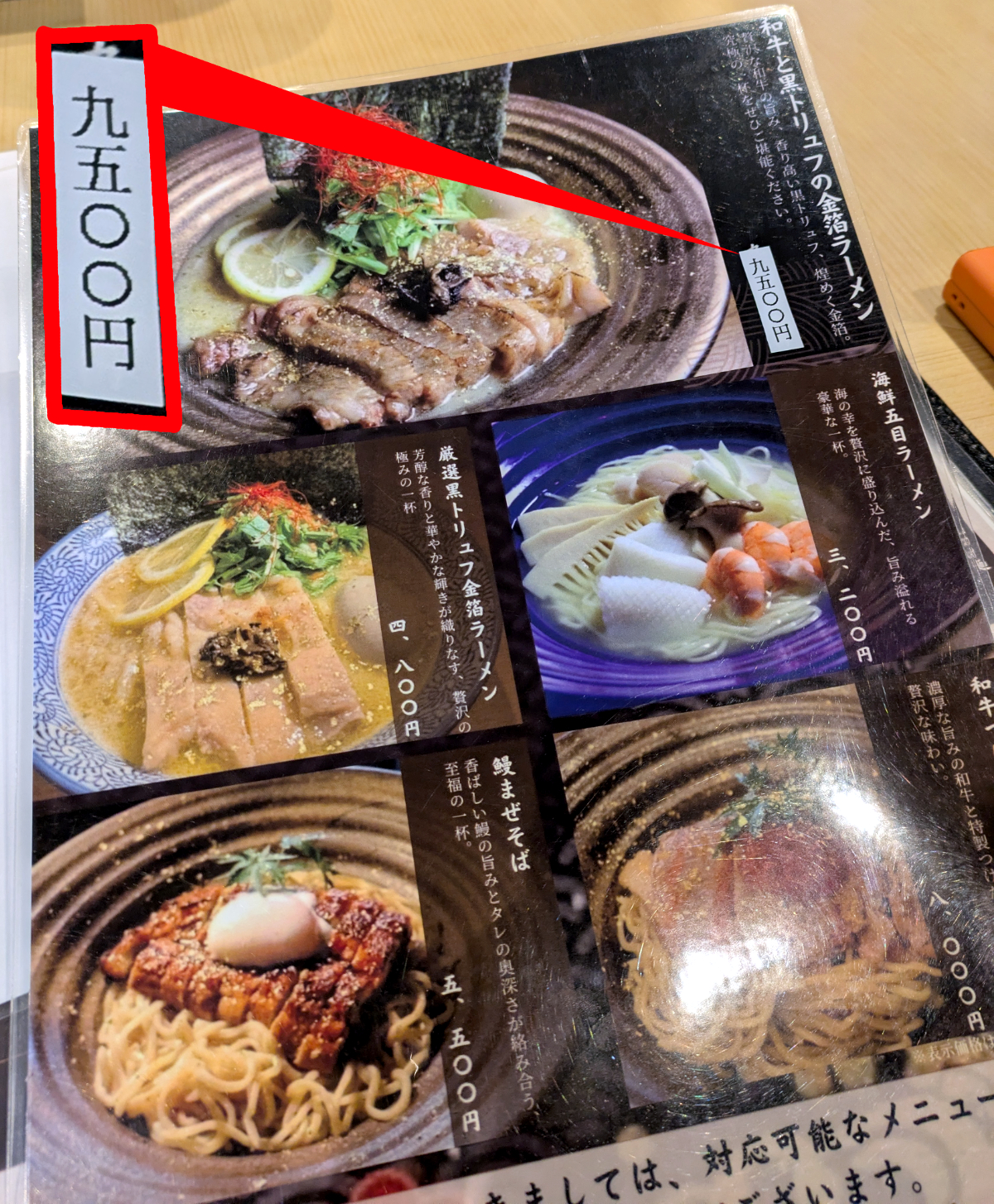 980円でも築地の相場からすれば安いなあ。と思いつつも、ページをめくると次ページにはしっかり築地メニューがあった。「和牛と黒トリュフの金箔ラーメン」は税込9500円! 600円のラーメン15杯食える~ッ!
