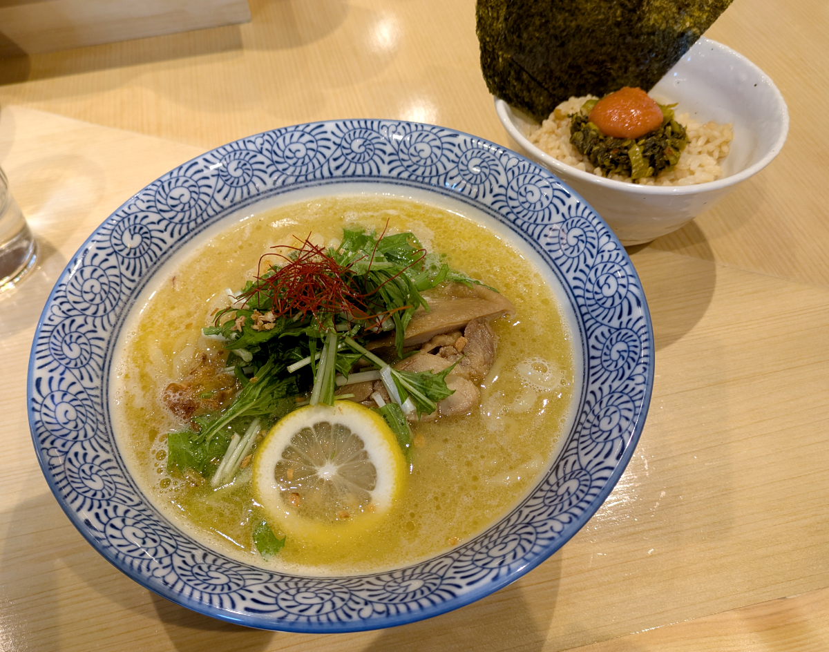 歯ざわりの良いオリジナルのちぢれ麺とスープの相性はバツグン。鶏チャーシューまで入っていて、600円で頂くのが申し訳ないほどの珠玉の1杯だ。アクセントのレモンの酸味も〇。