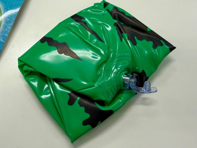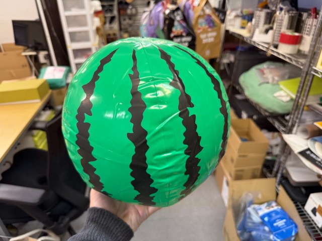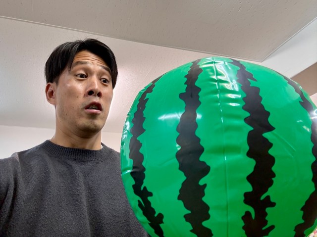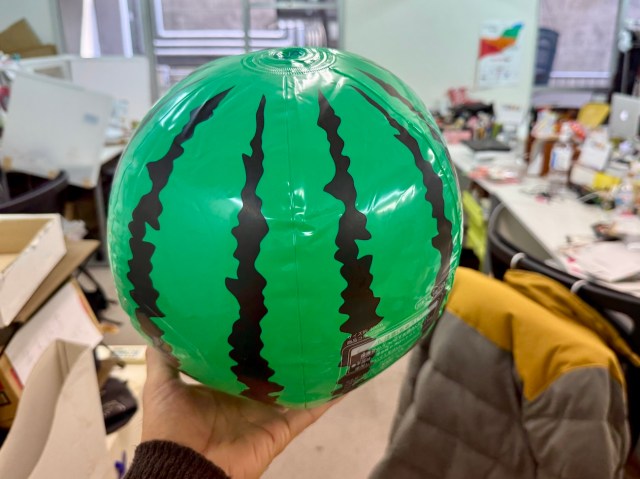 その後、家で膨らませるのは違うという結論に達した私は、編集部にスイカボールを持っていった。当然ながら「なぜ?」という空気にはなったものの、いちいち説明するのも面倒なので無言で空気を入れることに。