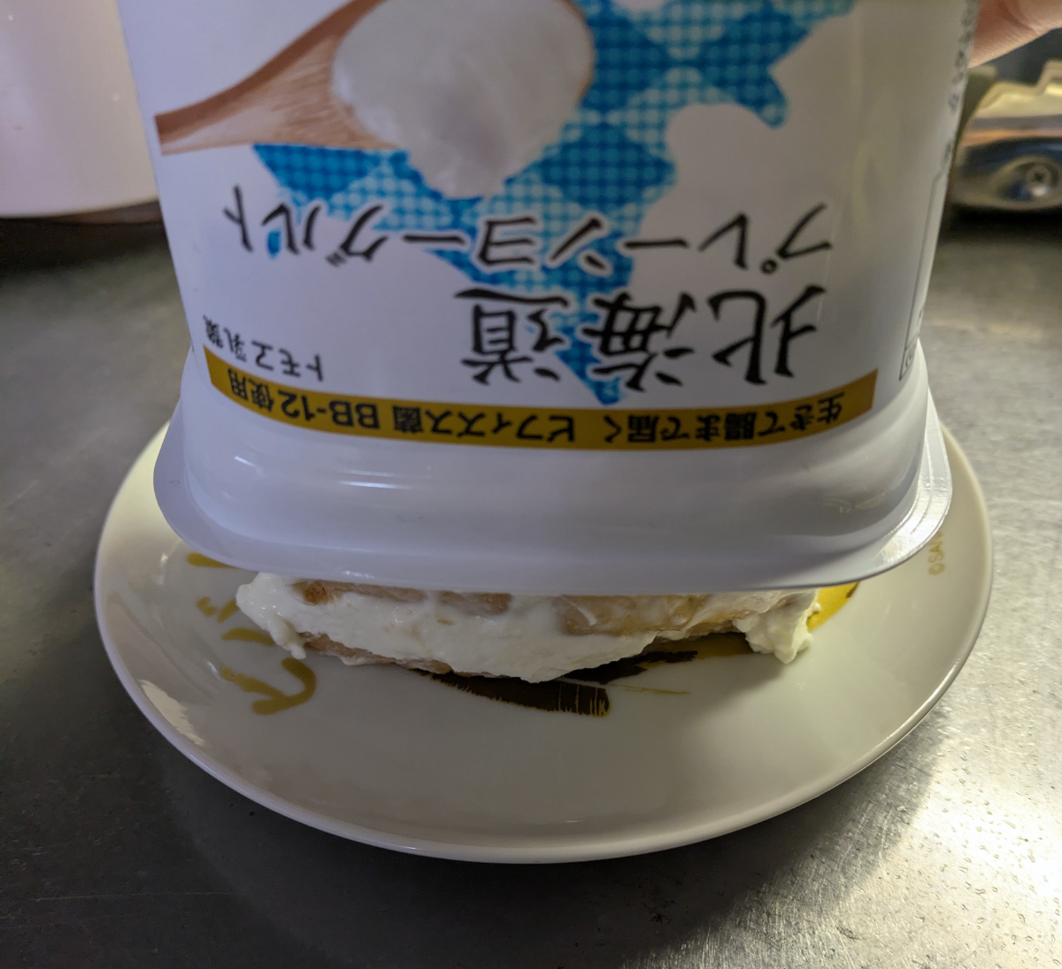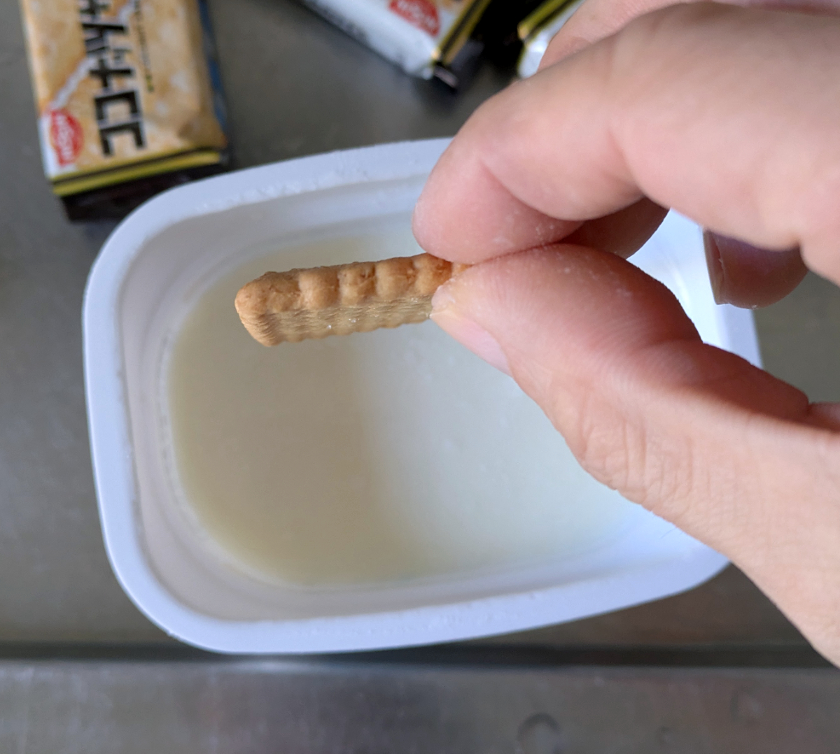 ヨーグルトのフタを外して、あとはできる限りサブレをぶっ刺すだけ。