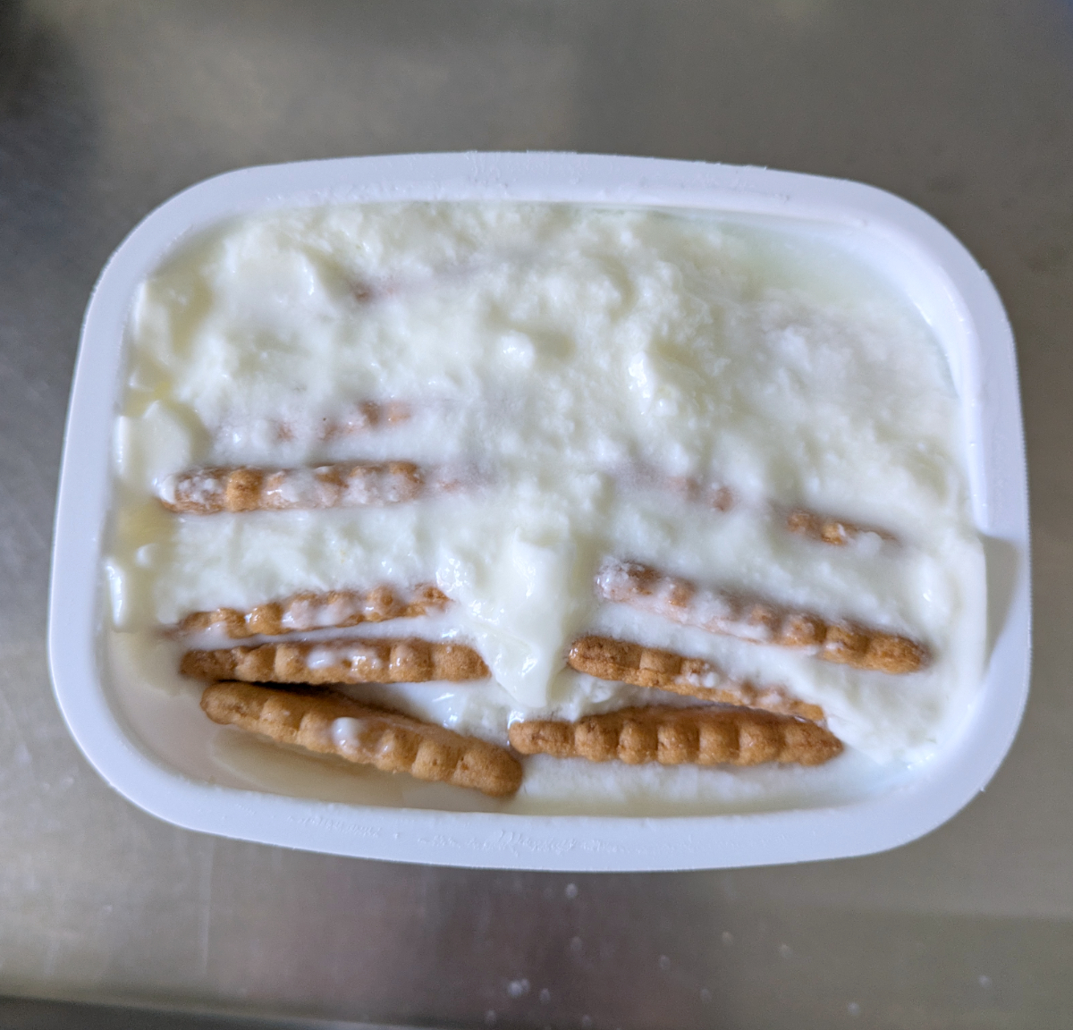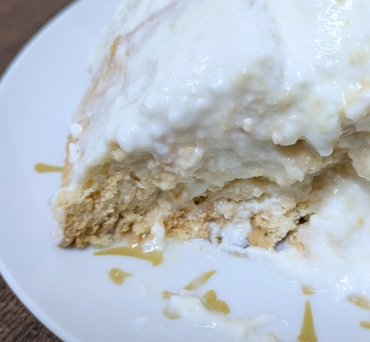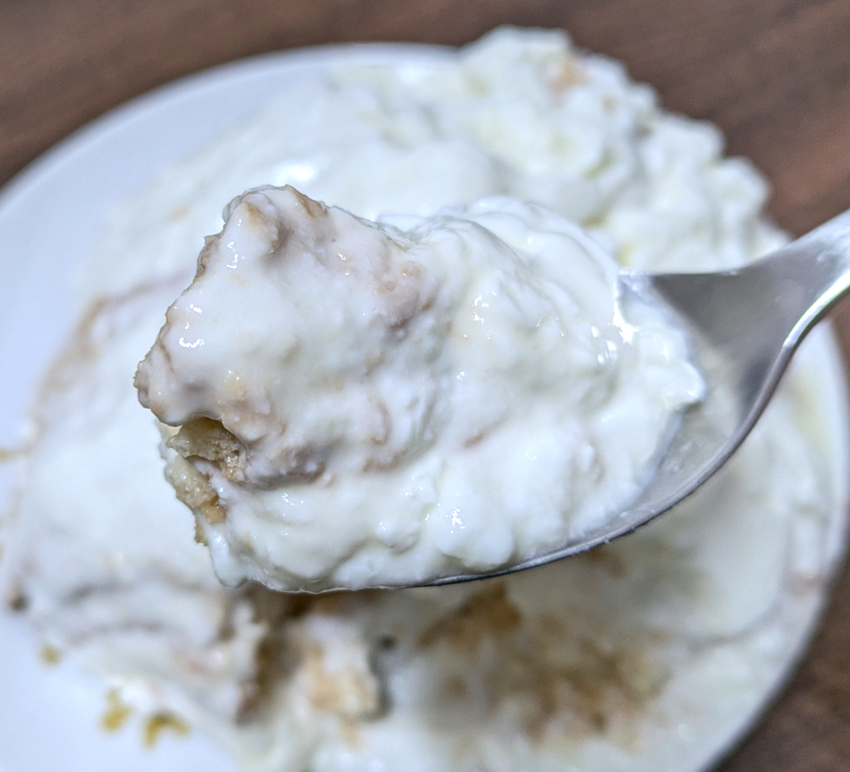 チーズケーキ……、いや、コレは……。ヨーグルトに突っ込んでしなびたココナッツサブレだな……。どう贔屓めに見てもチーズケーキではない……。