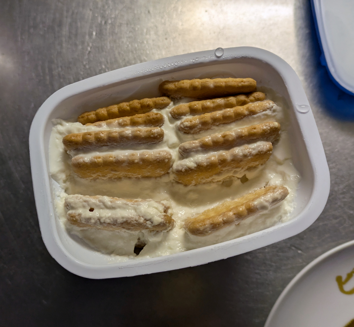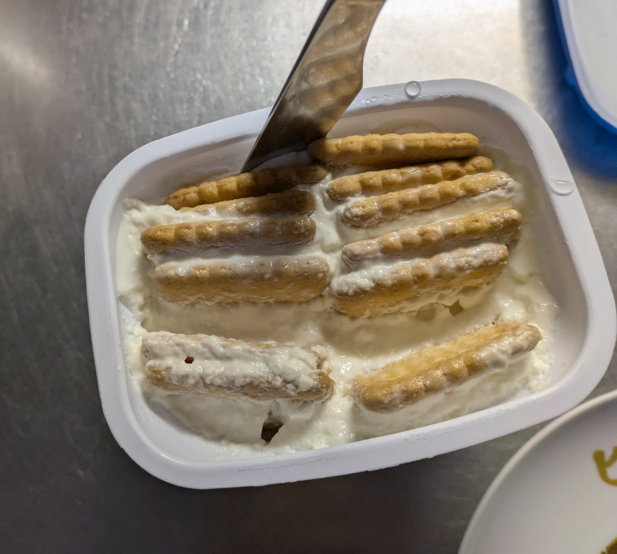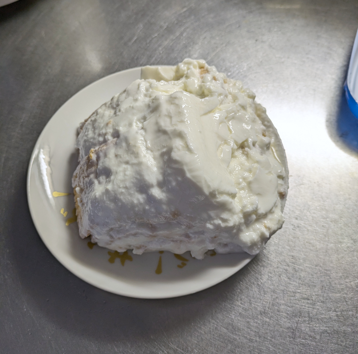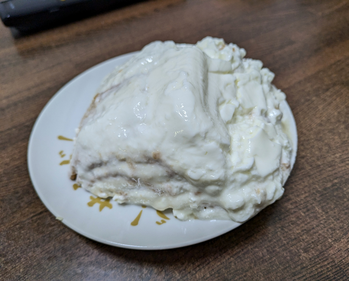 チーズケーキ……、いや、コレは……。ヨーグルトに突っ込んでしなびたココナッツサブレだな……。どう贔屓めに見てもチーズケーキではない……。