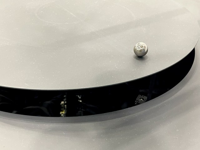 3つのモノキャリアが精密に動いて円盤の傾きを作り、玉の位置をぴたりと一点に止める! 落ちそう……だけど落ちない!! 正確に制御できるので玉は落ちません!」