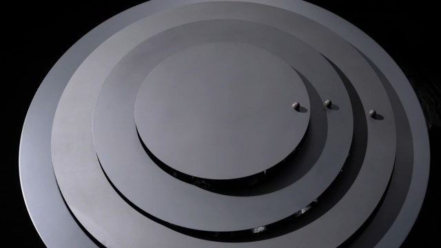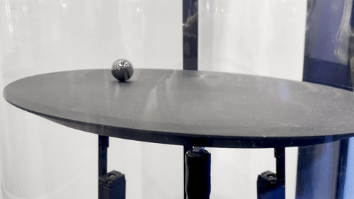 去年は3対の振り子型機構が主役だったのに対し、今回登場するのはゆらゆらと傾く3つの円盤。その上を3つの玉が自由に行きかっている。
