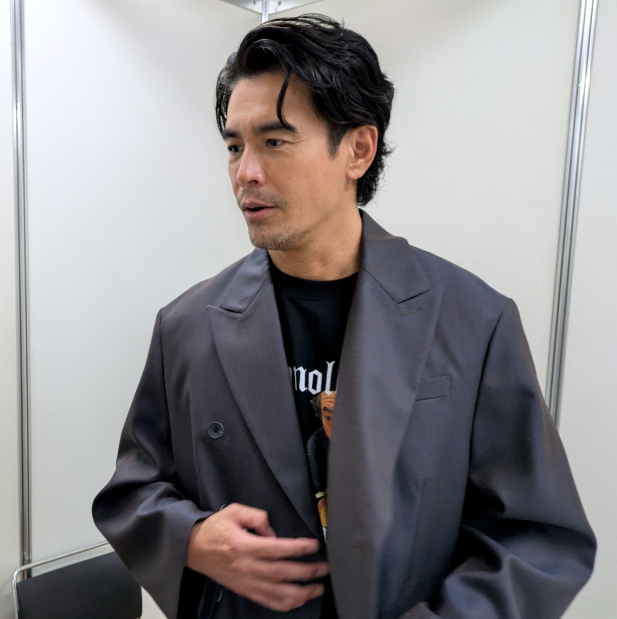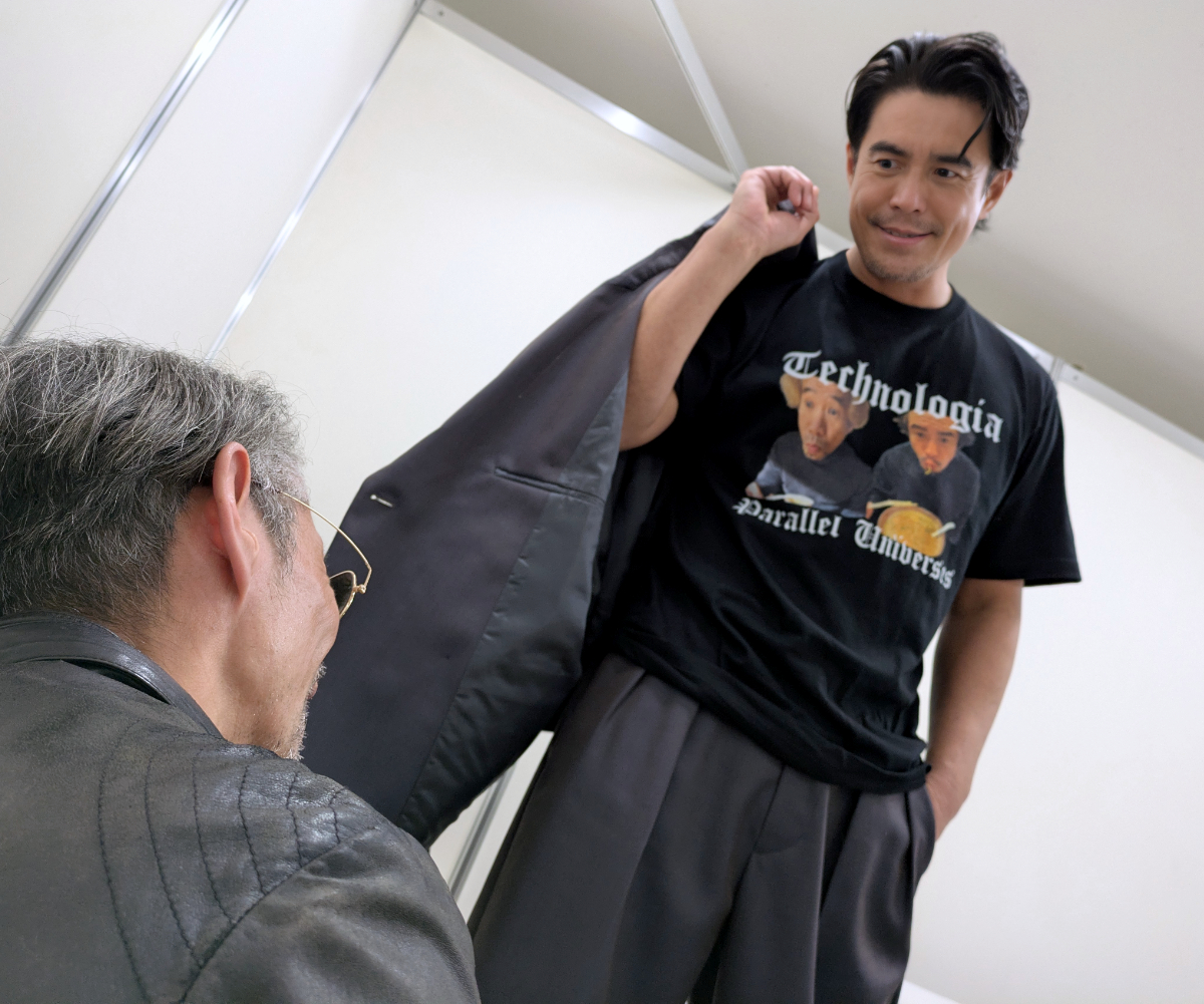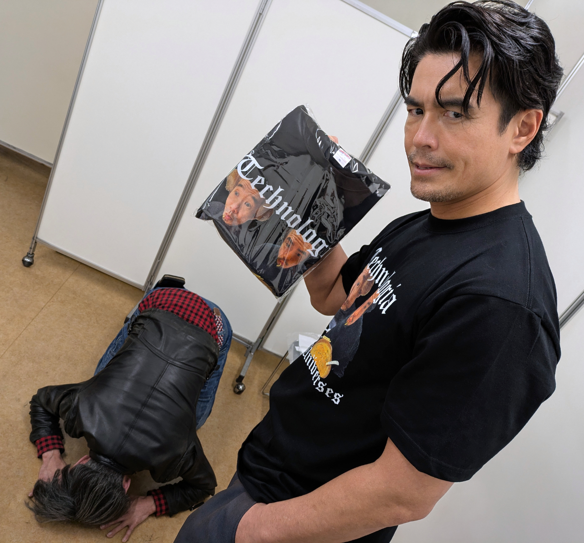 あまり顔を近づけすぎると失礼かな? 怒鳴り込むような演出はマズいかな? なんて思いながらも、恐るおそる撮影を進めていたところで、突然伊藤さんが上着を脱いで、このTシャツを披露。
