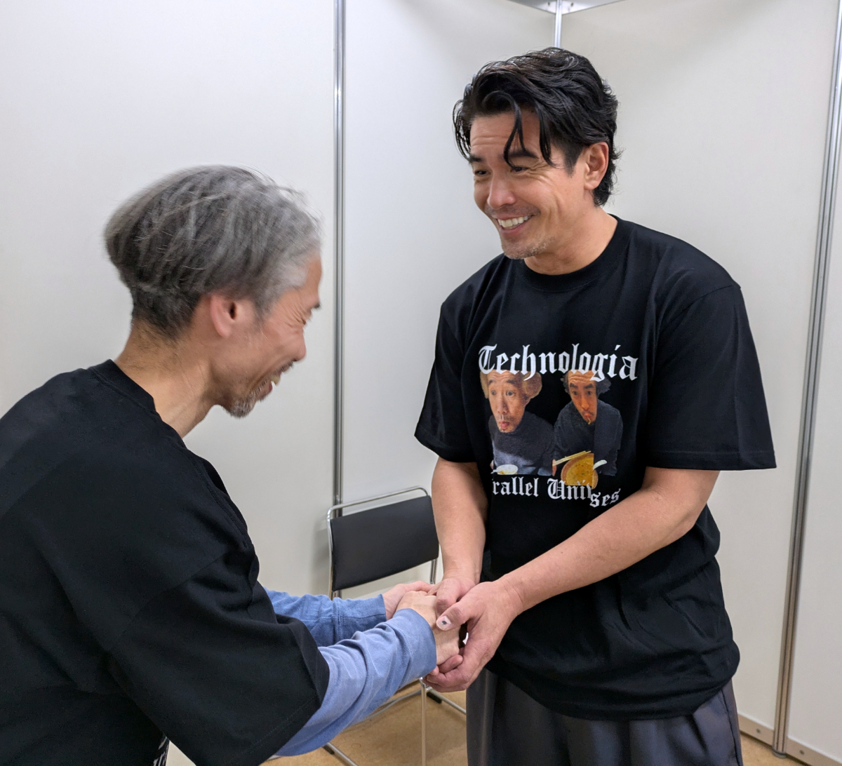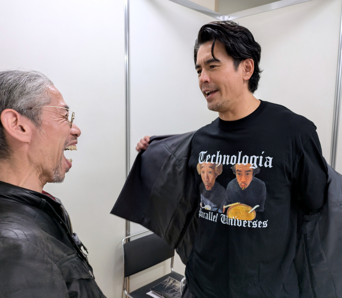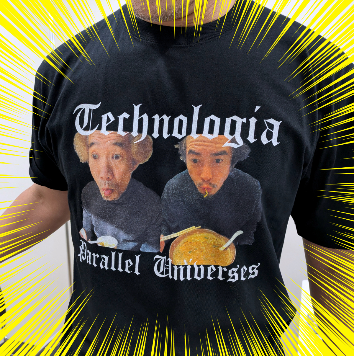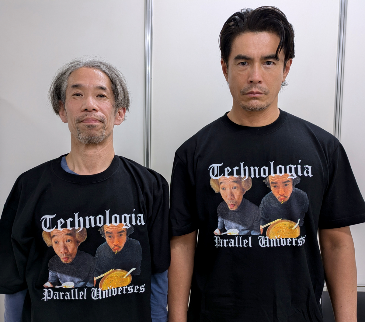 「Technologia Parallel Universes」の文字に2人が麺をすする顔写真。