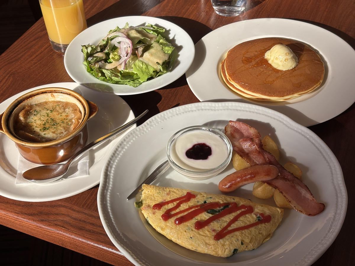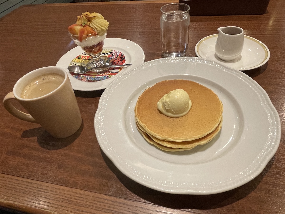 お高めのモーニングセットのパンをパンケーキに変更するのだ。これにより、元から卵料理・ベーコン・ソーセージ・コーンスープ・サラダ・ドリンクバーが揃っているところに、あのクラシカルなパンケーキまで付いて来ることになる。