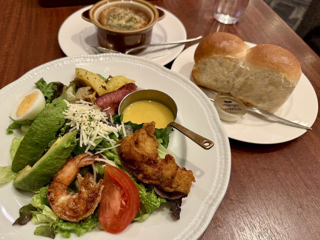 渋谷のロイホはメインみのあるものは最安でも1133円なので、上記2つとメイン料理の注文は2000円以内では不可能。だがこれを可能にするのが『食いしんぼうのシェフサラダ ブランチセット』である。普通にコスパが良いと思ったのでこれに賭けることにした」