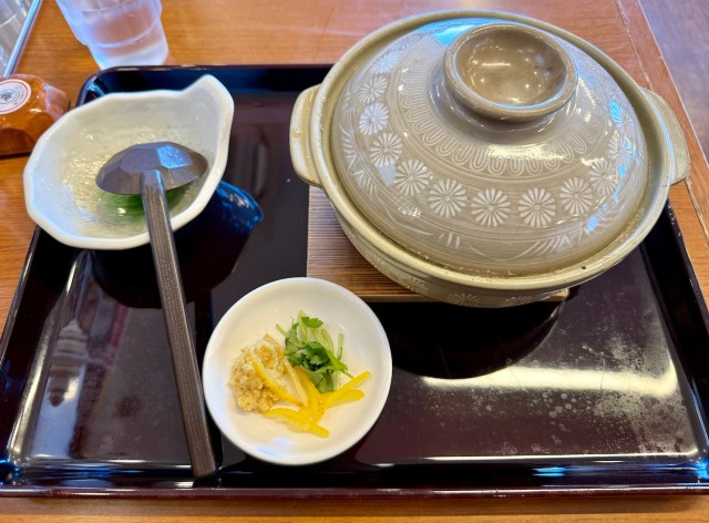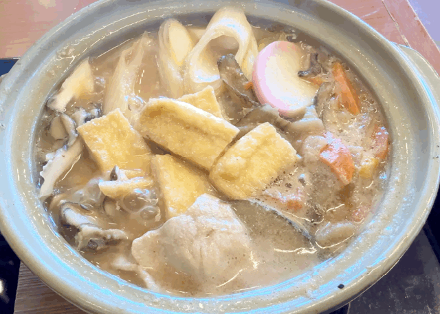 待つこと5分ほどでフタ付きの土鍋が運ばれてきた。フタを開ける瞬間が楽しいのも鍋焼きうどんの醍醐味である。さっそく開けてみると……