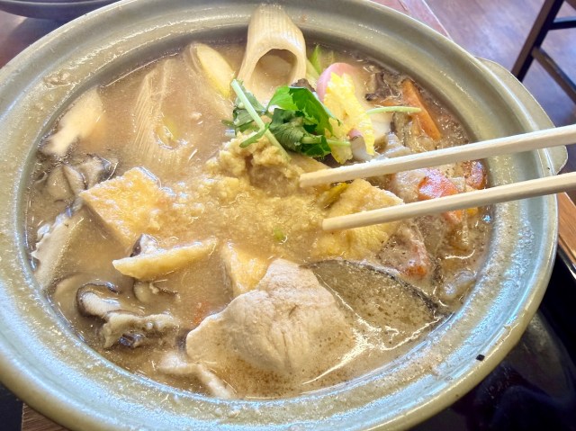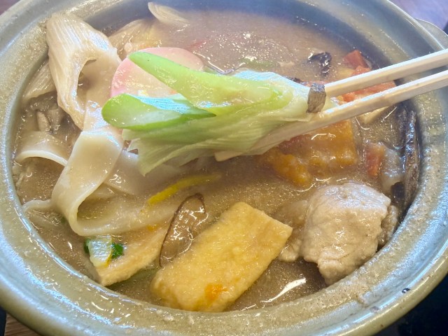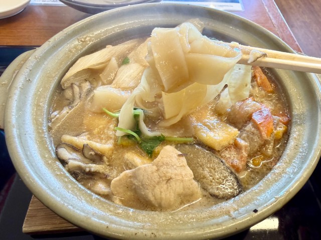 冒頭でお伝えしたように、注文したのは「特製味噌の鍋焼きほうとう」。なんでも渋沢栄一も愛した「煮ぼうとう」をアレンジしたメニューらしい……急に感じられる歴史の重み。