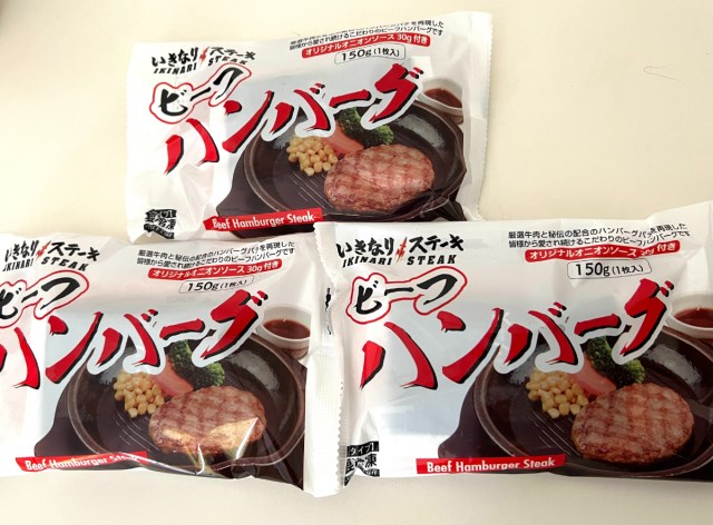 続いてクール宅急便で届いた肉類を紹介しよう。まずは「冷凍いきなり!ビーフハンバーグ(150g×3個)」。