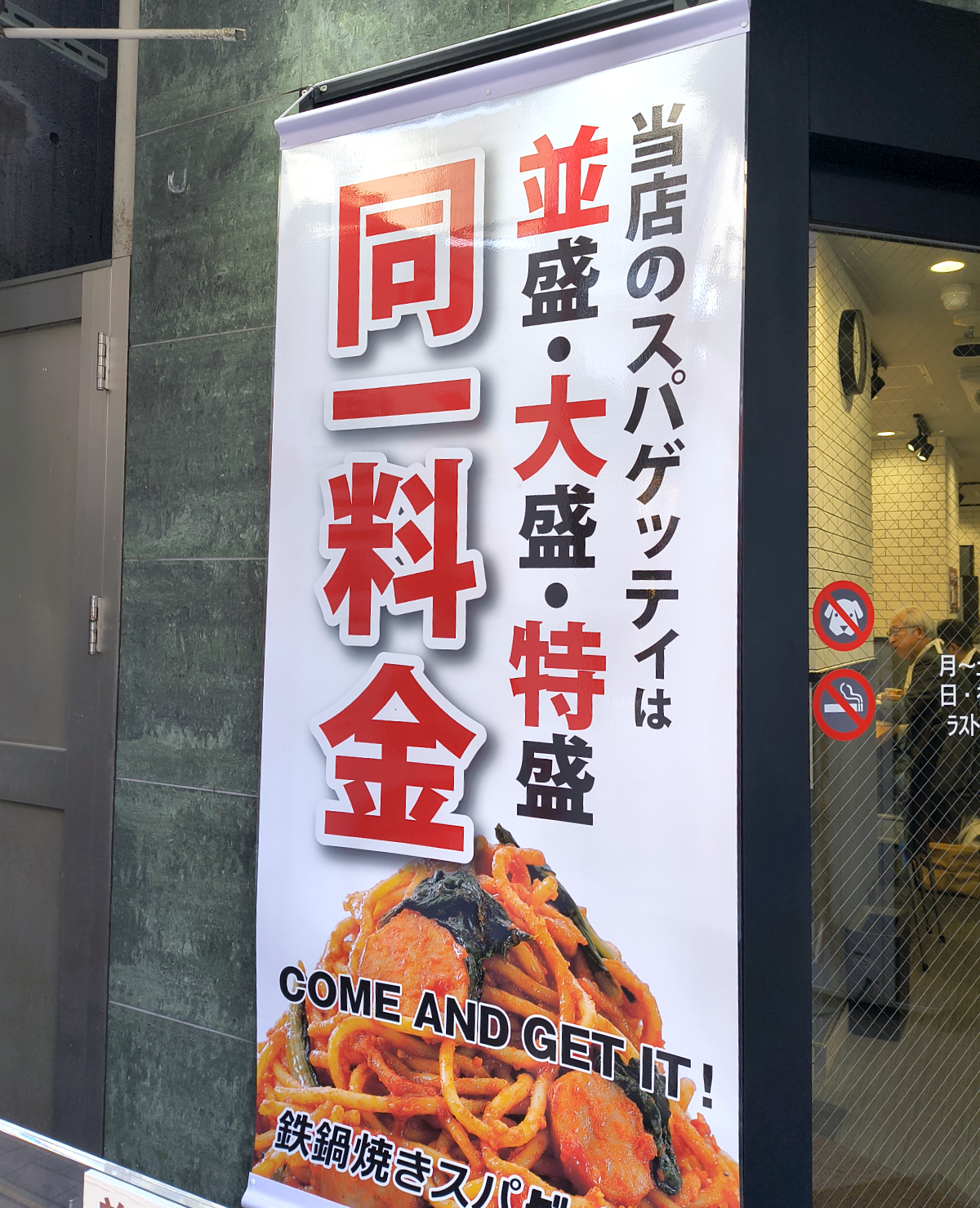 メニューを見ると、ここが「スパゲティ」と称していることがよくわかる。ナポリタンやミートソースのほかに醤油バジリコや和風カルボナーラ、焼きめんたいや黒胡麻肉味噌など、いわゆる和製スパゲティが主力メニューとなっている。