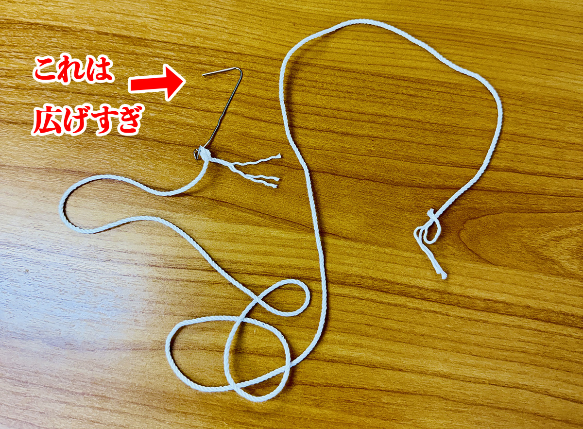 クリップを曲げて、タコ糸と繋げたらこうなる。ちょうど釣り糸みたいな感じだけど、あまり「釣り針」を広げすぎないこと。