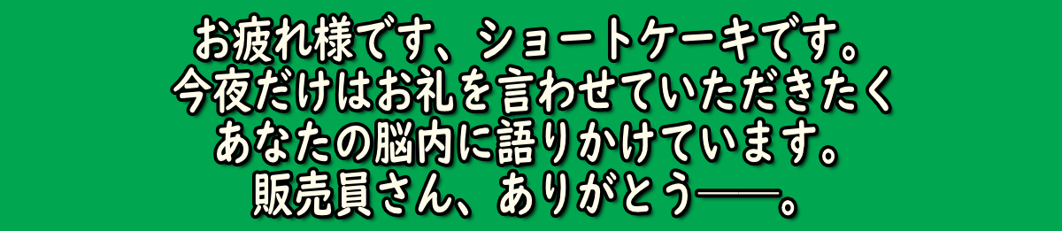 10.「お疲れ様です、ショートケーキです。今夜だけはお礼を言わせていただきたくあなたの脳内に語りかけています。販売員さん、ありがとう──。」