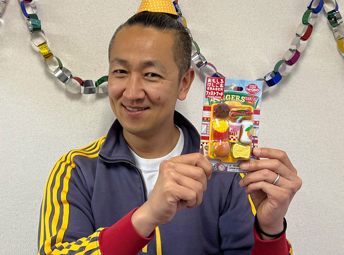 「子供はだいたい消しゴム好きなのと、こういうものが懐かしくて『おもしろけしごむ』を買って来ました。配る相手が女子だともっとファンシー向けっぽいものを選んでたんですけど……今回いるのが男子ばっかりなので(笑)」