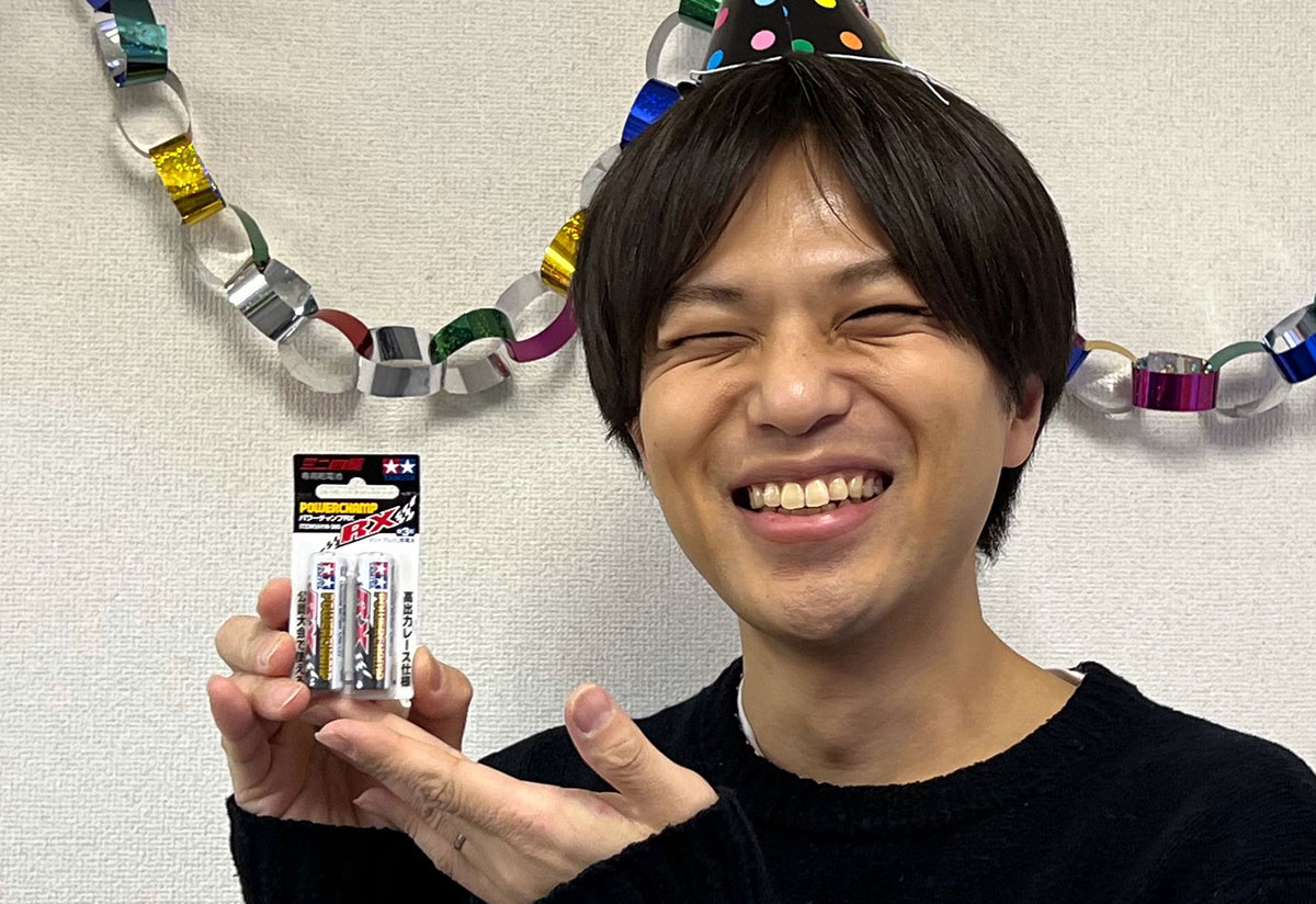 「僕が買って来たのはミニ四駆の電池・パワーチャンプRXです。僕が小学生の頃はパワーチャンプゴールドっていう商品名だったんですけど、鉄板中の鉄板で、これをもらって喜ばないヤツはいないと。