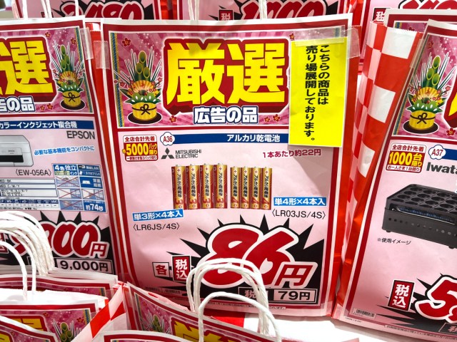 ──ということで、今年もジョーシンの『初売超特価福袋』は期待を裏切らないラインナップだった。特に驚きだったのは4本パックで税込86円の電池。コンビニ価格の約4分の1以下という破格の値段は、福袋シーズンならではの大盤振る舞いだ。