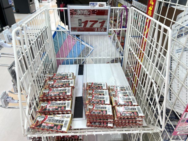 1本あたり約22円という驚異的な価格。コンビニで同じものを買ったら、4本パックで400円近くするはずだ。ちなみに売り場を見てみると、さらにお得な初売り価格の電池も発見。
