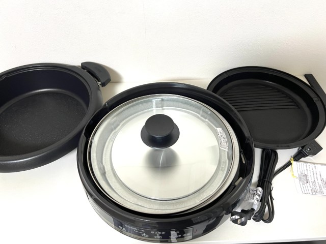 箱を開けてみると、深なべと波形プレートの2枚セット。さらにガラス蓋付きで、鍋料理から焼肉まで幅広く使える優れものだ。