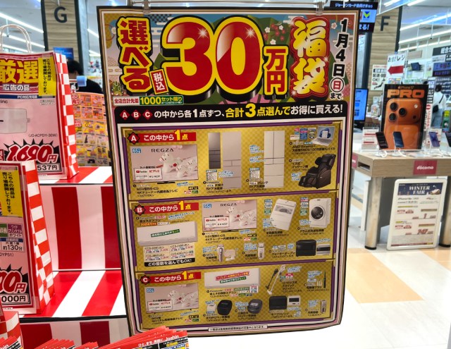 A・B・Cのカテゴリからそれぞれ1点ずつ、合計3点を選んで30万円という太っ腹な企画。65型テレビやドラム式洗濯機、マッサージチェアなど、かなり豪華なラインナップだ。