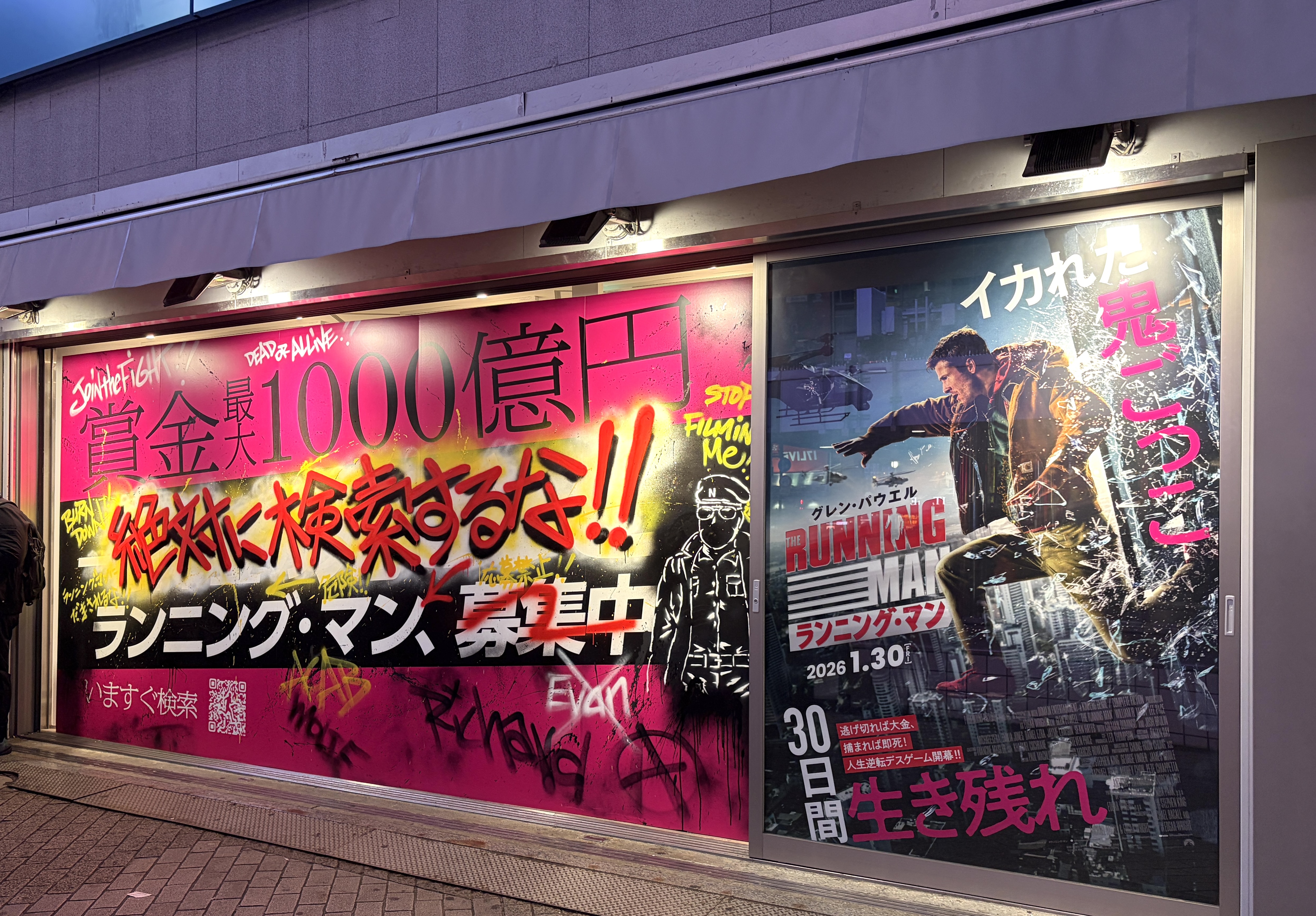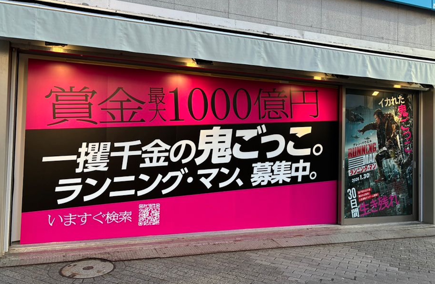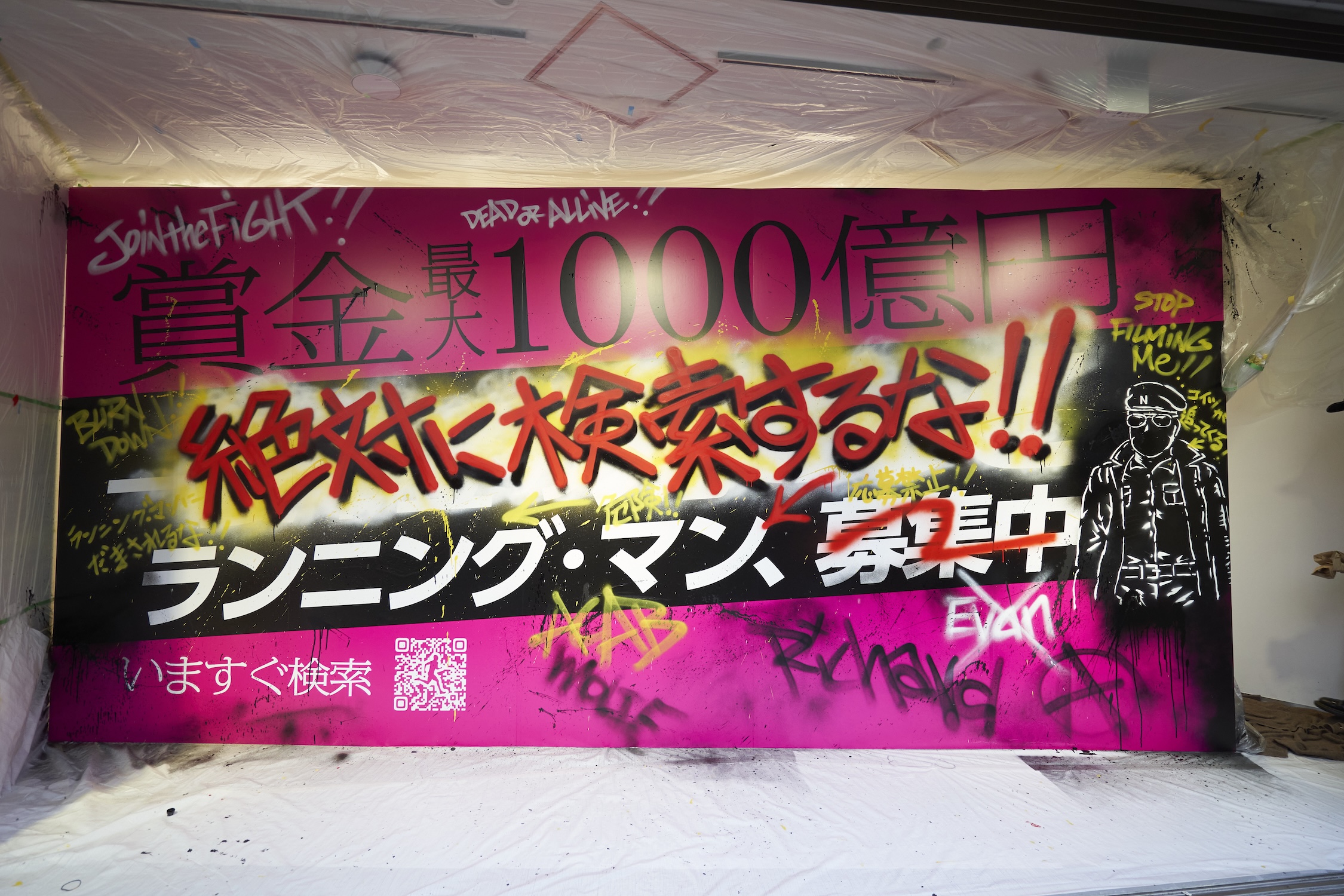 「一攫千金の鬼ごっこ」の部分が白く塗りつぶされ、「絶対に検索するな!!」と真逆の意味に書き換えられていく巨大看板。この怖そうな人は一体どういう立ち位置なのか? そして映画『ランニング・マン』とは、果たしてどういうストーリーなのか……?