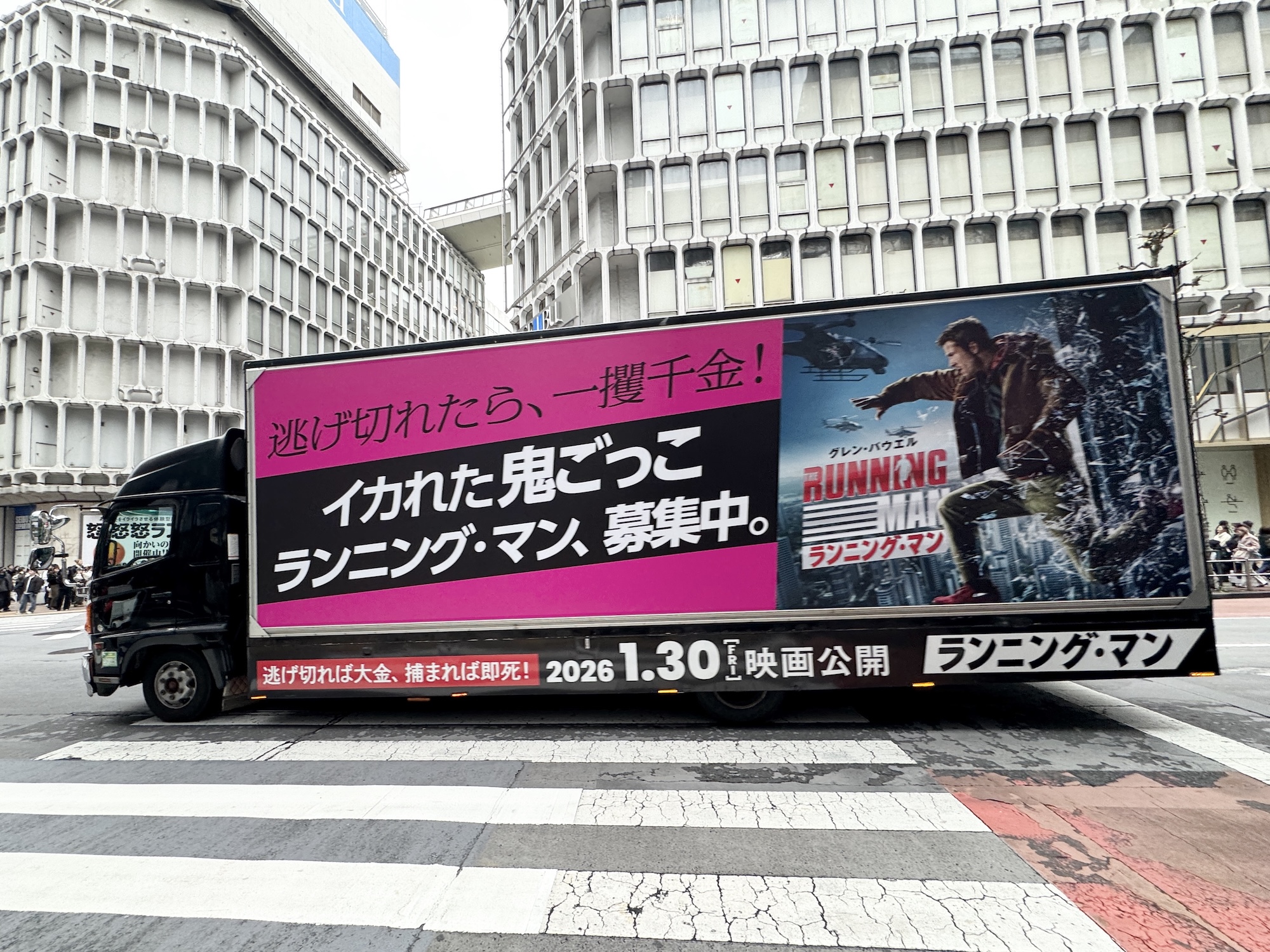 映画『ランニング・マン』の渋谷ジャックは12月29日まで。何度も言うけど、個人的にはアドトラックだけでも絶対に見ておいてほしいと思う。どことなく不穏な渋谷を感じたい人、スクランブル交差点あたりに集合!