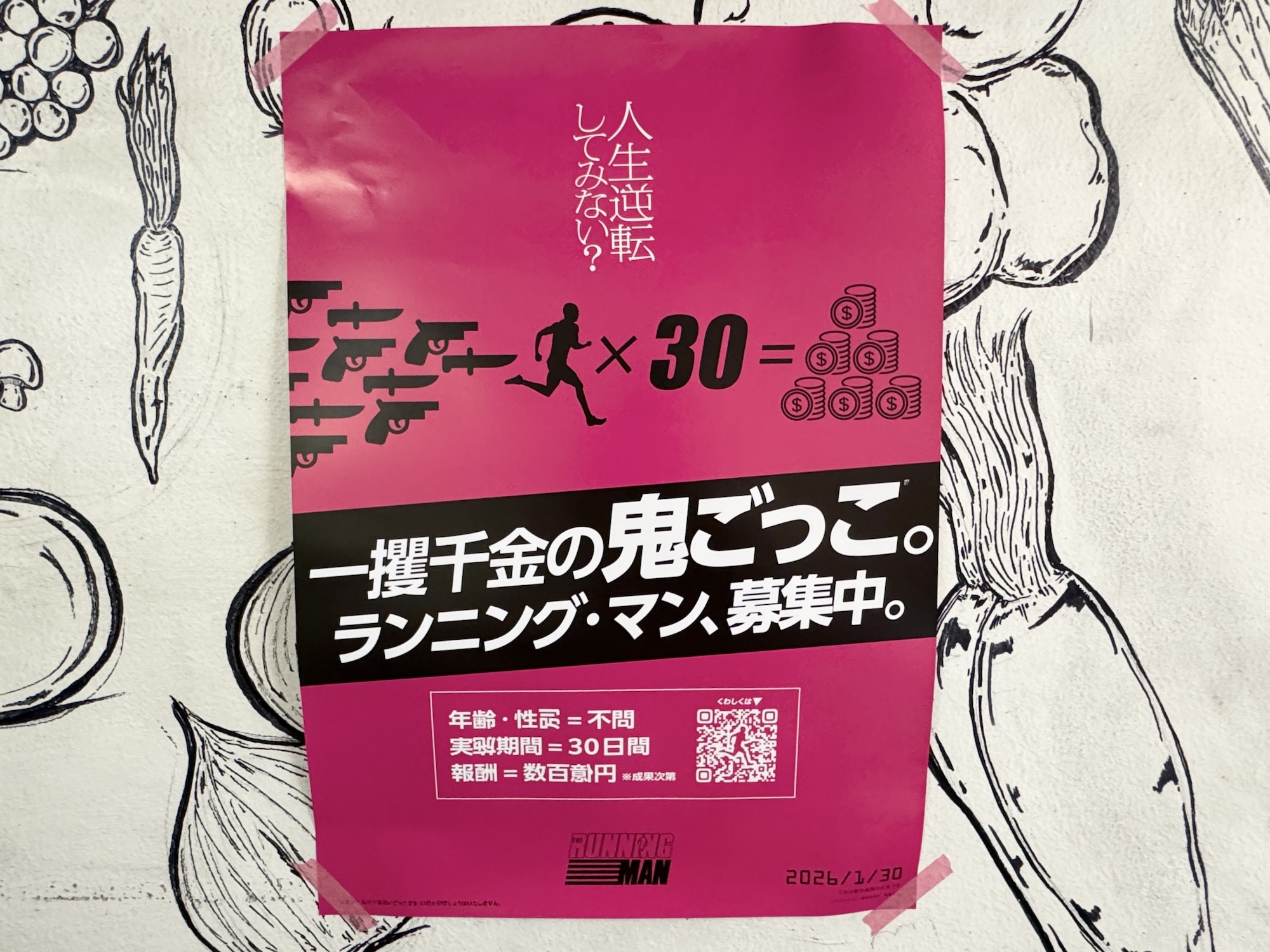 「ランニング・マン、募集中」……何のこっちゃサッパリ分からん。そう思いながらしばし眺めていたところ、道ゆく人々も「え、何これ?」と言いながら通り過ぎていた。ですよね〜。